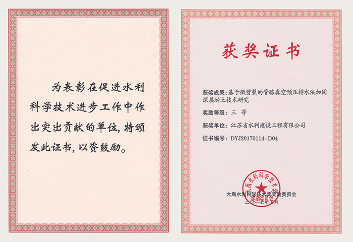 2017大禹水利科學技術獎(基于微劈裂的管路真空預壓排水法加固深層淤土技術研究)