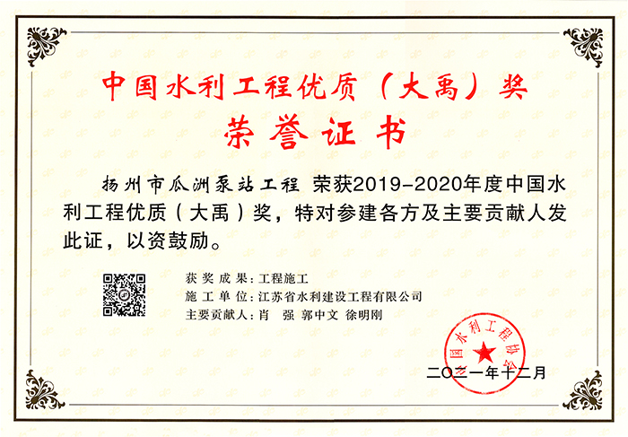 2019-2020中國水利工程優質(大禹)獎(揚州市瓜洲泵站工程)