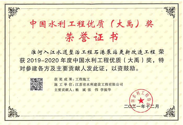 2019-2020中國水利工程優質(大禹)獎(淮河入江水道整治工程石港泵站更新改造工程)
