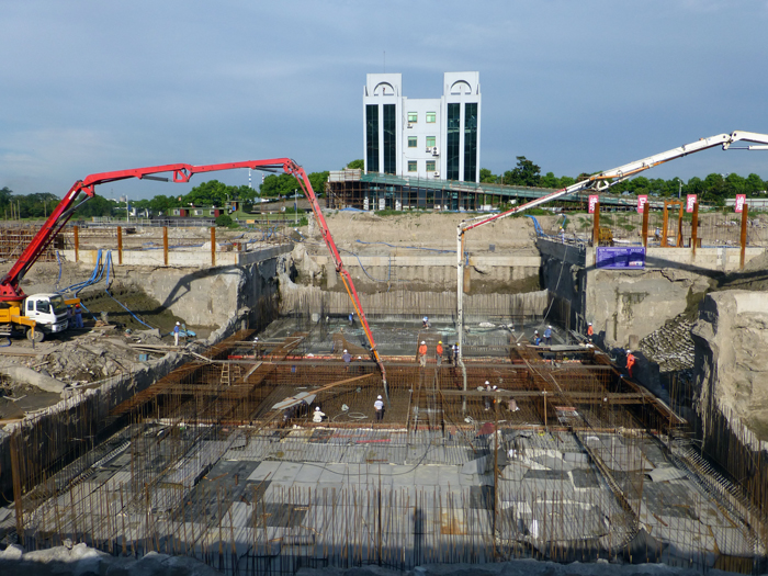 上閘首底板位于泰州引江河二線船閘的上游,左側是一線船閘上閘首,一、二線船閘縱向中心線距離僅70m;底板底高層▽-8.1。按照施工工藝是在上閘首采用圍封地連墻進行基坑支護,基坑開挖后進行底板施工。7月15日,基坑開挖到位并封底。為減少基坑暴露對一線船閘的影響,全體施工人員頂焦陽、冒酷暑,日夜奮戰。7月22日完成了基坑內所有樁頭鑿除、止水安裝等底板施工前準備工作,7月30日300多噸底板鋼筋綁扎完成。混凝土大澆筑于7月30日下午6時開倉,分左中右三塊穿插進行。至8月2日上午9時,已完成左右兩塊,共澆筑混凝土約2800方。目前中間部位的底板正在澆筑中。
