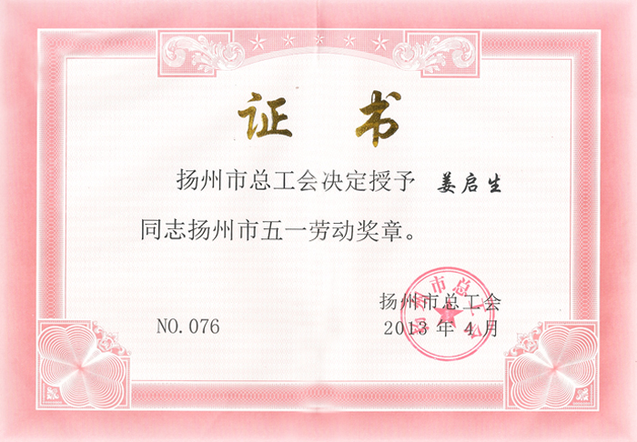 4月26日下午,揚州市慶“五一”建功立業表彰大會上又傳來喜訊,我公司工會主席姜啟生被授予“揚州市五一勞動獎章”榮譽稱號,表彰了他在創新工作方式、推進工會建設、促進公司發展等方面作出的積極貢獻。