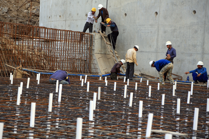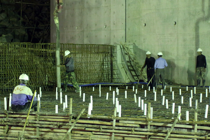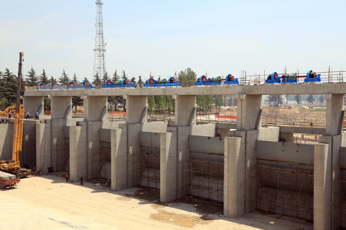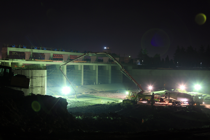 “下一步我們將集中精力完成最后一塊消力池澆筑,翼墻墻后回填土填筑,補齊上下游護坡護底,以及加緊進行閘門、啟閉機和小水電電機安裝調試,預計到5月20日可基本完成全部水下工程,為提前實現通水驗收目標創造有利條件?!表椖拷浝砝钚潞8嬖V記者。記者注意到,李經理黝黑的臉龐上充滿著自信的笑容。而在項目總工周海銀心里更有一筆帳:“泗陽閘工程從正式開工到現在,3個多月時間,拆掉一座老閘,新建了一座7孔(孔寬10m)的節制閘和兩孔小水電,完成砼近30000方。高峰期投入近500號人,模板近20000平方米,鋼管900余噸,扣件10多萬只。人員和周轉材料的投入是類似正常工程的兩倍以上。近一個多月來,工作面全面打開后,每天都是兩臺以上泵車在澆筑混凝土,連續有上百個小時的澆筑強度?!背R幍耐度氡WC了搶工的需要,但大量的人力物力帶來的是工程更周密的計劃、更繁瑣的安排、更嚴格的考核。項目部兩天一次生產會,主要管理人員每天至少一次碰頭會,一切都按計劃有條不紊的進行。所有人員都按照計劃按時按點的堅守崗位,只能提前,不能落下,特殊部位調整時必須把時間再搶回來。
