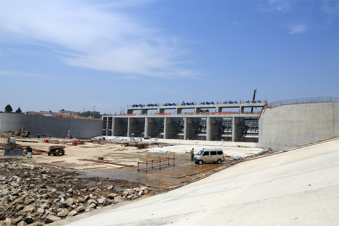 同時,科學的施工調度管理,使現場多點作業同步施工,交叉繁忙而井然有序;而敬業的管理隊伍、熟練的技術工人,保證了施工效率,實現了人、機、料、法、環各個要素的有機融合。工程施工場地狹小,進出場道路不暢,曾一度束縛了節制閘施工的手腳。省廳、地方政府和工程建設處各級領導給予了極大的關心,李亞平廳長、陶長生副廳長等廳領導多次現場檢查指導,協調解決工程難題。