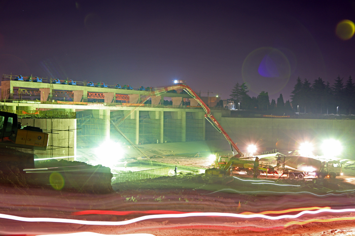 科學(xué)的施工調(diào)度管理,果斷的現(xiàn)場(chǎng)決策,使現(xiàn)場(chǎng)多點(diǎn)作業(yè)同步施工,交叉繁忙而井然有序。敬業(yè)的管理隊(duì)伍、熟練的技術(shù)工人,保證了施工效率,實(shí)現(xiàn)了“人、機(jī)、料、法、環(huán)”等各個(gè)要素的有機(jī)融合。施工高峰階段,每天保持兩臺(tái)以上泵車澆筑混凝土,連續(xù)有上百個(gè)小時(shí)的澆筑強(qiáng)度。在混凝土200多次開倉(cāng)澆筑中,幾乎沒(méi)有一次是上午進(jìn)行的,一般都是白天立模晚上澆筑,通宵完成,決不會(huì)拖到第二天。以南二聯(lián)孔(6~7號(hào)孔)施工過(guò)程為例: