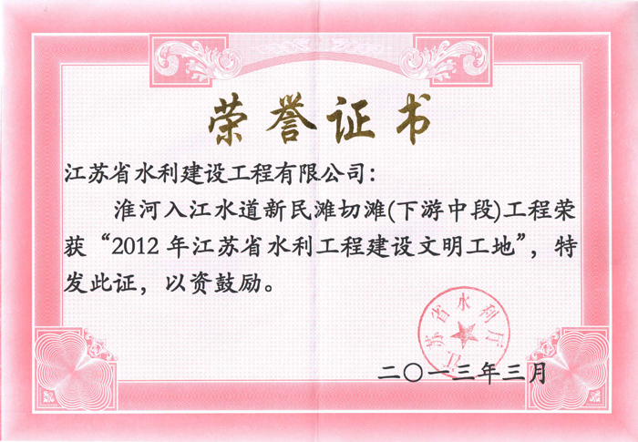 公司連續多年被評為全國水利建設先進集體、全國優秀水利企業、全國安全生產和質量管理先進單位、江蘇省文明單位、建筑業百強企業,榮獲江蘇省“五一勞動獎章”。