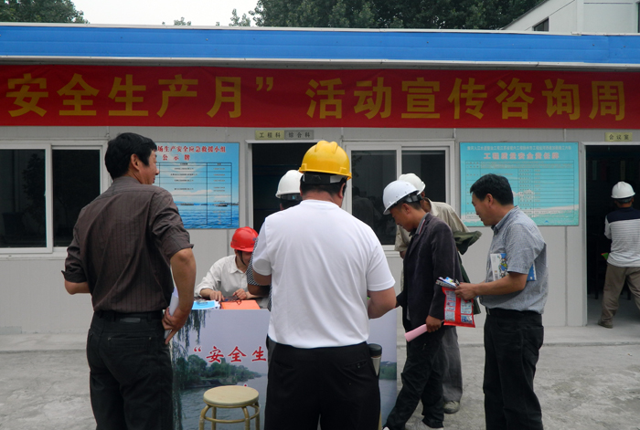 項(xiàng)目部在現(xiàn)場(chǎng)設(shè)置了宣傳咨詢服務(wù)臺(tái),就安全生產(chǎn)法律法規(guī)、施工安全、用電安全進(jìn)行現(xiàn)場(chǎng)咨詢,耐心解答員工提出的有關(guān)問(wèn)題,并向員工發(fā)放了“安全生產(chǎn)八字警句”等宣傳資料。一線員工還積極參加了安全生產(chǎn)知識(shí)猜謎活動(dòng)。