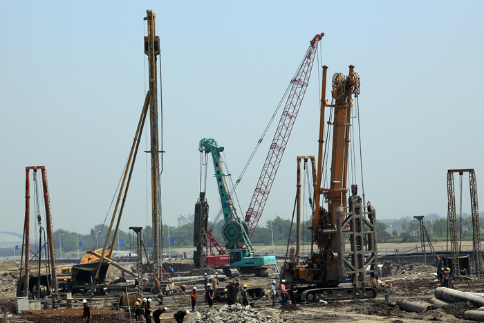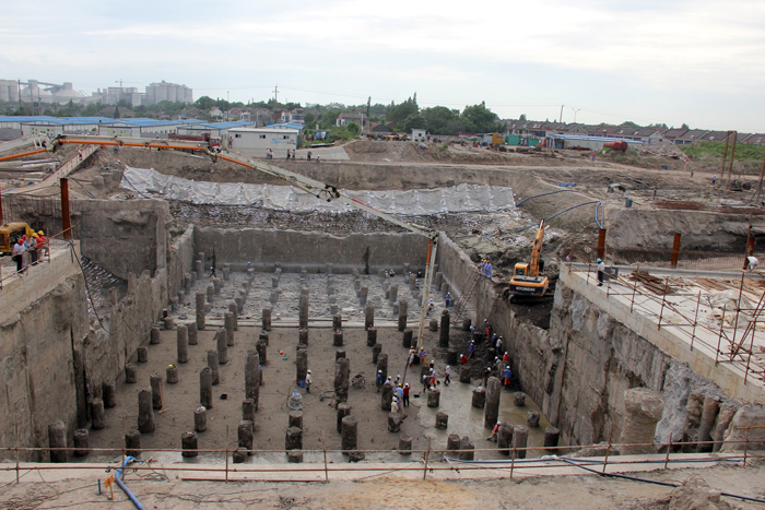 建設施工單位及時把脈現場工況條件,綜合比選各種地基處理方案,針對不同部位的土質情況和結構施工需要,綜合應用了地下連續墻(壁厚分別為80厘米60厘米30厘米)、鋼筋混凝土灌注樁(樁徑分別為1200毫米800毫米600毫米)、多頭小直徑水泥攪拌樁、單頭攪拌樁、高壓擺噴樁、旋噴樁、鋼板樁等多種樁型進行地基及防滲處理,累計施工各類樁基 4000 根。基礎及防滲工程混凝土總量近6萬立方米,占工程全部混凝土總量的50%,其品種之多、施工量之大為船閘工程少見。