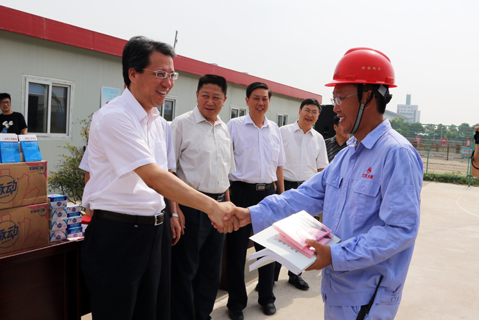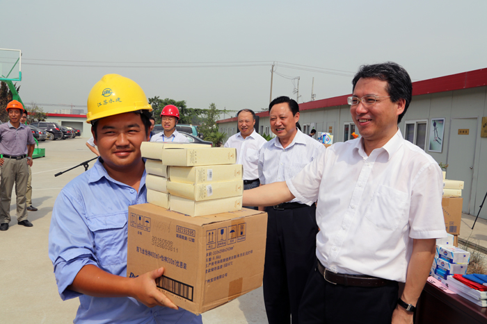 韓全林一行深入一線工地,親切看望和慰問了工地建設者,將礦泉水、毛巾、防暑降溫用品和《勞動保護手冊》、安全宣傳教育光盤等慰問品送到建設管理者手中,他還詳細詢問了他們的生產、生活情況,并勉勵大家要鼓足干勁,爭取又快又好地完成引江河二期工程建設任務。