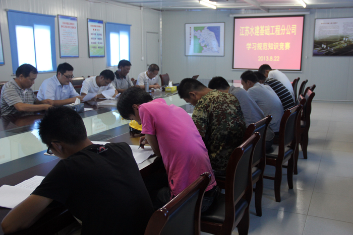 為響應省水利廳關于《加強質量強水建設的指導意見》的通知精神,迎接公司開展2013年“質量月”活動,達到全員自覺參與質量管理、提高工程質量管理水平的目的,基礎工程分公司5~8月份組織開展了“學習規范”知識競賽活動。根據工程分散、人員不能相對集中的情況,基礎工程分公司通過發動宣傳、組織學習、分片考試等形式,組織人員學習質量管理知識,檢驗學習教育成效。目前,活動第一季——《建筑樁基技術規范》(JGJ94-2008)知識競賽于8月30日順利結束。