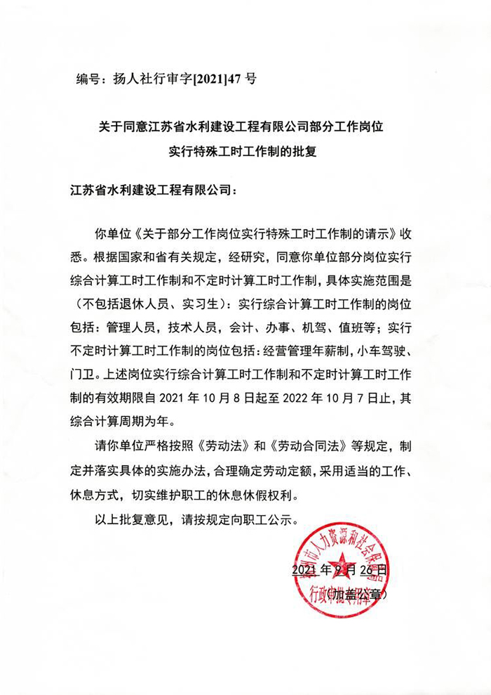 關于同意江蘇省水利建設工程有限公司部分工作崗位實行特殊工時工作制的批復
