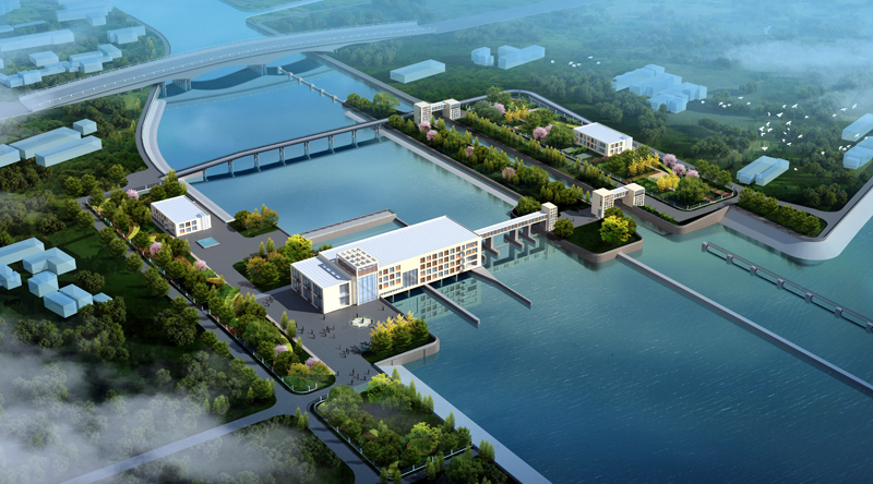 新溝河延伸拓浚江邊樞紐工程是新溝河與長江交匯口的控制性建筑物,位于無錫江陰市申港鎮濱江村新溝河入江口,由節制閘、泵站、船閘和魚道四部分組成,節制閘為中型攔河、擋潮水閘,共5孔總凈寬48m。泵站為大II型泵站,裝立式軸流泵組6臺(單向排水和雙向引排各3臺),正向排澇(排水)規模為180m3/s,反向引水規模為90m3/s。船閘級別為Ⅴ級,通航凈寬18米。魚道規模為2m(寬)×55m(長)。工程建成后將具有引水改善水環境、擋潮、防洪、排澇、航運及過魚等綜合功能。