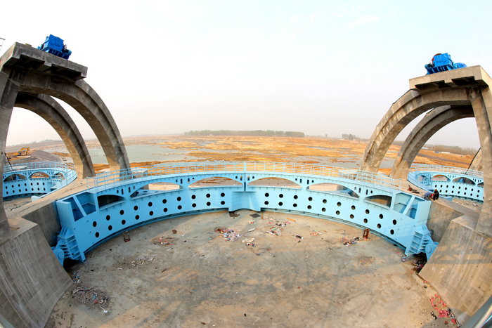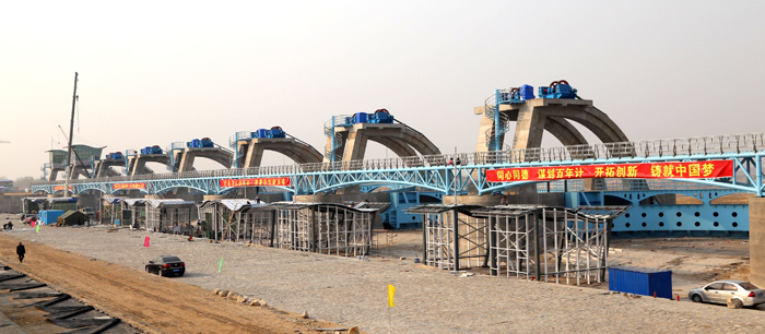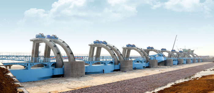 4月16日,由江蘇省水利機(jī)械制造有限公司承建的亞洲最大的水利攔河閘壩工程——青島市大沽河水資源開(kāi)發(fā)利用工程通過(guò)水下驗(yàn)收。該項(xiàng)目是青島治河史上規(guī)模最大、周期最長(zhǎng)、檔次最高的綜合性基礎(chǔ)建設(shè)項(xiàng)目,總投資額1.2億元,金屬結(jié)構(gòu)共3000噸,5600萬(wàn)元,包括9扇25M×3.5M護(hù)鏡式鋼閘門(mén)及9臺(tái)套2×1250KN盤(pán)香式卷?yè)P(yáng)啟閉機(jī),閘門(mén)頂部設(shè)置人行橋;下游側(cè)配套9座人行鋼橋。該攔河閘壩工程被譽(yù)為亞洲第一壩。