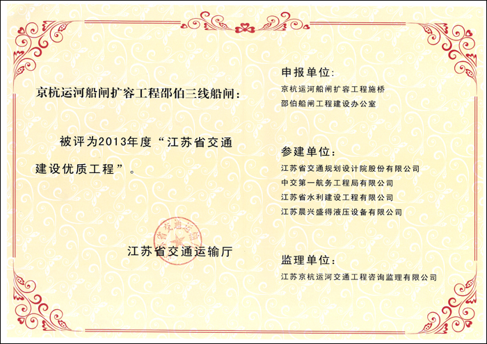本站訊,近日,由我公司參建的京杭運河擴容工程邵伯三線船閘工程被江蘇省交通運輸廳評為“2013年度江蘇省交通建設優質工程”。