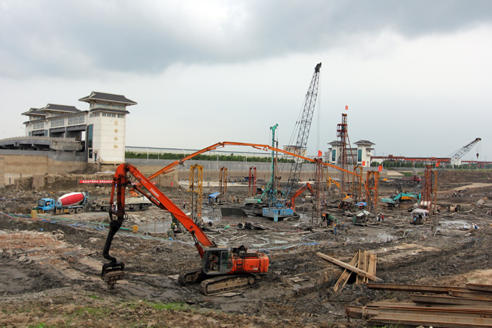 沒有熱情洋溢的動員,也沒有信誓旦旦的表態(tài),項(xiàng)目部全體員工立即行動起來。他們倒排工期,一個節(jié)點(diǎn)一個節(jié)點(diǎn)的去攻克。第一個節(jié)點(diǎn)目標(biāo)是在9月初完成泵站1#站身底板施工。圍繞這個節(jié)點(diǎn),項(xiàng)目部要迅速完成2000多米鋼板樁支護(hù)、7000多方灌注樁、4000多米攪拌樁的施工。樁基施工完成后,還有