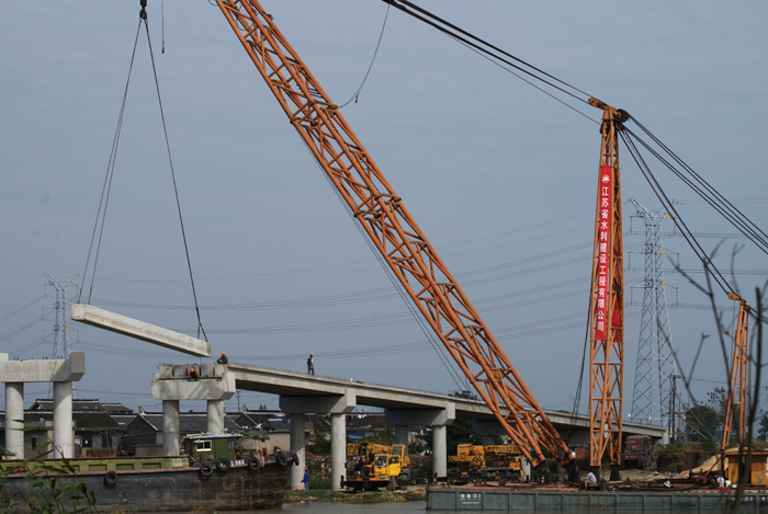 董潭生產橋是南水北調泰州市鹵汀河拓浚跨河橋梁工程兩座中的其中之一,全長348.3米,接線長707.021米,主跨為85米桁架梁,兩側引橋為13孔20米的先張預應力空心板梁。