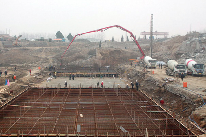 泗陽節制閘閘室底板共分3塊,其中中板底板為3孔一聯,北側邊孔為2孔一聯,南側邊孔為2孔一聯。閘底板順水流向長20.0米,垂直水流向長86.34米,底板面高程8.50米,厚1.5米,底板總面積為1960平方米,此次南側塊底板共澆筑混凝土696立方。
