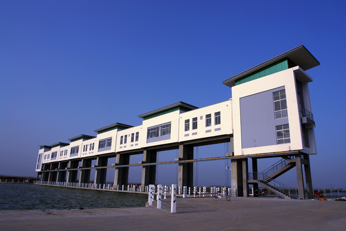 以海口樞紐為主要控制建筑物的新沂河整治工程集防洪、生態、景觀于一體,造型美觀,視覺豐富,景色優美,以其嶄新的姿態靜臥于淮北大地,保護著駱馬湖周邊和沂南、沂北八百多萬畝耕地、570萬人民生命財產安全,同時還改善了淮北地區的生態條件,更可與通榆河相連,實現水資源的優化調度。
